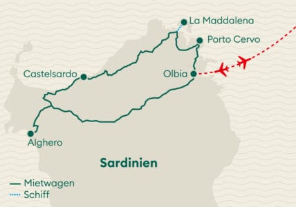 Betörende Wildkräuter, Olivenhaine, atemberaubende Küsten und erstaunliche Zeugnisse der Vergangenheit: Sardinien bietet eine überraschende Vielfalt.  Das wahre Sardinien findet man weitgehend im Landesinnern, wo die Geschichte der Insel in den Traditionen weiterlebt. Sardiniens Strände zählen zu den schönsten in ganz Europa. Karibisch-weisser Sand und unwirkliche Felsformationen prägen die Insel. Dazu gibt es einen Mix aus italienischem und orientalischem Essen und beste Weine!