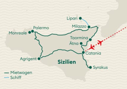 Sizilien – ein Paradies für alle, die auf der Suche nach einer Insel sind, die ihre authentische Atmosphäre bewahrt hat und sowohl über ein reiches kulturelles Erbe als auch über eine beeindruckende Natur verfügt. Die Insel blickt auf eine bewegte Geschichte mit verschiedensten Kulturen und Epochen zurück. Noch heute sind davon in den Ausgrabungsstätten zahlreiche Überreste zu sehen. Darüber hinaus gibt es etliche landschaftliche Highlights zu entdecken wie etwa die Vulkane Ätna und Stromboli, das Naturreservat Monte Fossa delle Felci und schwarze Strände. Kurz und bündig: Sizilien bietet alles für eine perfekte Rundreise im Mietwagen!